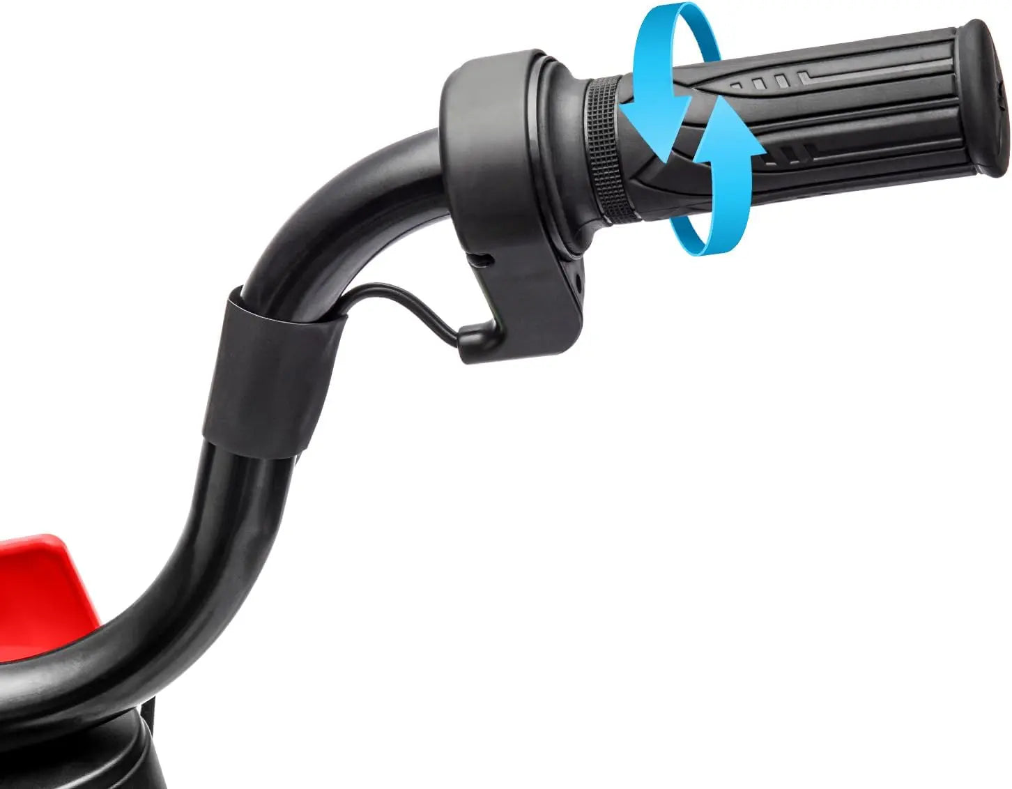 Fun Features: Cool decals, built-in music, bluetooth for playing your favorite songs. The twist-grip throttle gives kids a sense of motor control and helps them learn to drive
