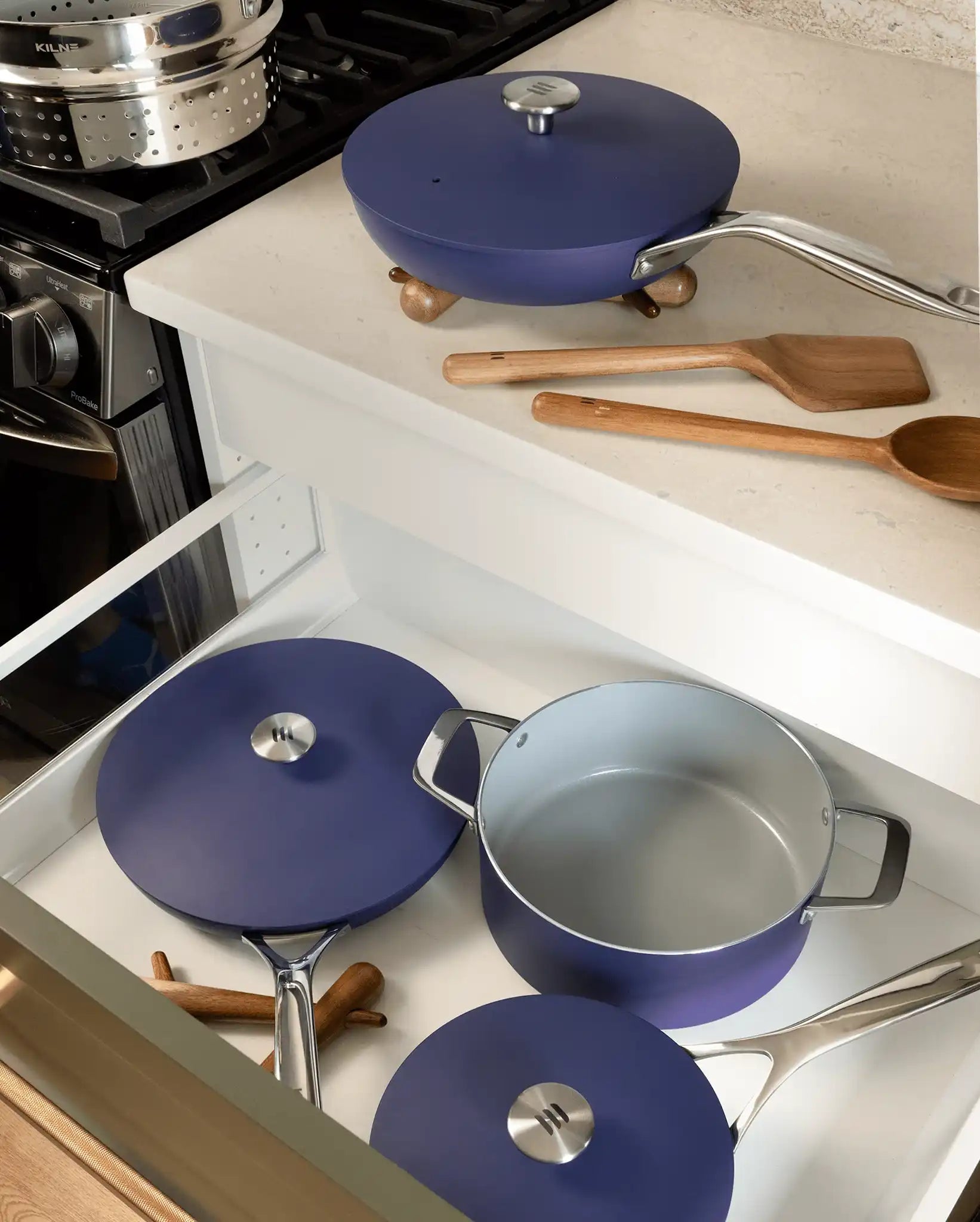 A multi-functional cookware set ready for every and any recipe. From one pot meals, to hosting a dinner party with main and sides, you're equipped to cook, serve, and store with ease.